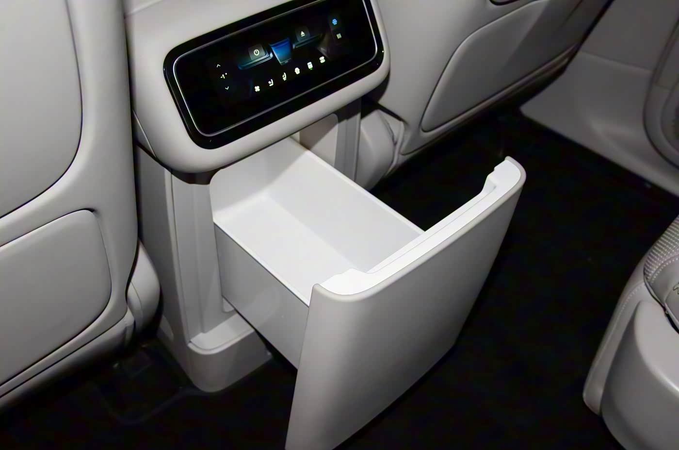 它的前排地台礼聘了高下双层缠绵,表层是杯架、手机无线充电面板和储物格,基层是一个一步地的储物格,前端还有车载香氛系统和手机充电接口。