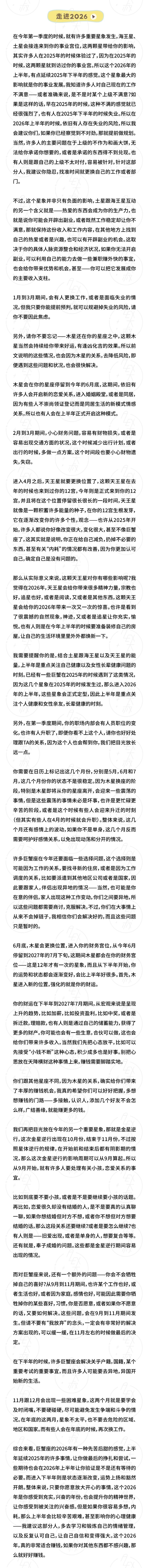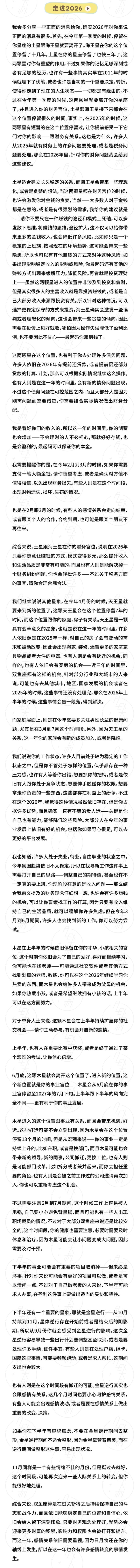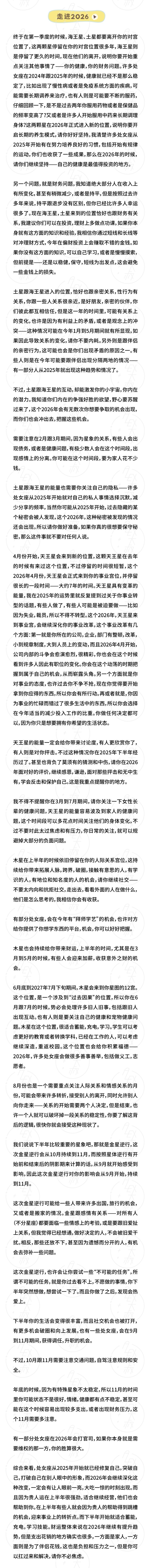 2026 年,该奈何界说它呢? 读者们常常只但愿得到一个准确的谜底: 好,如故不好? 就像我在正常收到的驳倒和私信里常被问到的那样—— 能不可平直告诉我,我的星座是好,如故不好? 无法恢复。 因为任何东说念主王人会在每一年里,有实足、幸福、光耀的技巧,也一定会有低垂、消千里、挫败的已而。 莫得哪一年,不错只用单一的景象去抽象、去定性。 但我不错告诉你的是: 2026 年,是一个请示你——走稳了,再走远的年份。 在星象层面上,紧要星体将在 2026 年完成位移,并在全新的位置停留多年。而这些变化