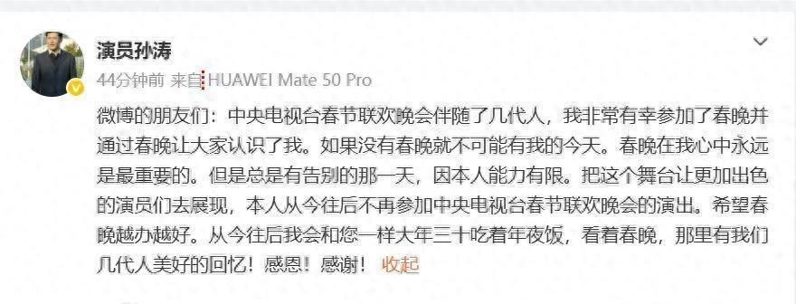 1月26日下昼,孙涛的一条微博让不少网友呆住了。这位伴随群众渡过18个大除夕的“春晚钉子户”,得当宣布今后不再插足央视春晚。 发文很通俗,莫得煽情,全是心里话。孙涛感谢了春晚对我方的树立,坦言“总有告别的一天”,意义是“本东说念主智力有限,思把舞台让给更出色的演员”。以后,他也要总结不雅众身份,大年三十在家吃着除夕饭看春晚了。 对好多东说念主来说,孙涛那张脸等于年味的一部分。从1995年第一次上台前垂危地找合影,到其后凭《祯祥三保》里的“我孤高”红遍宇宙,他在台上逗乐了不雅众几十年。但这几年,