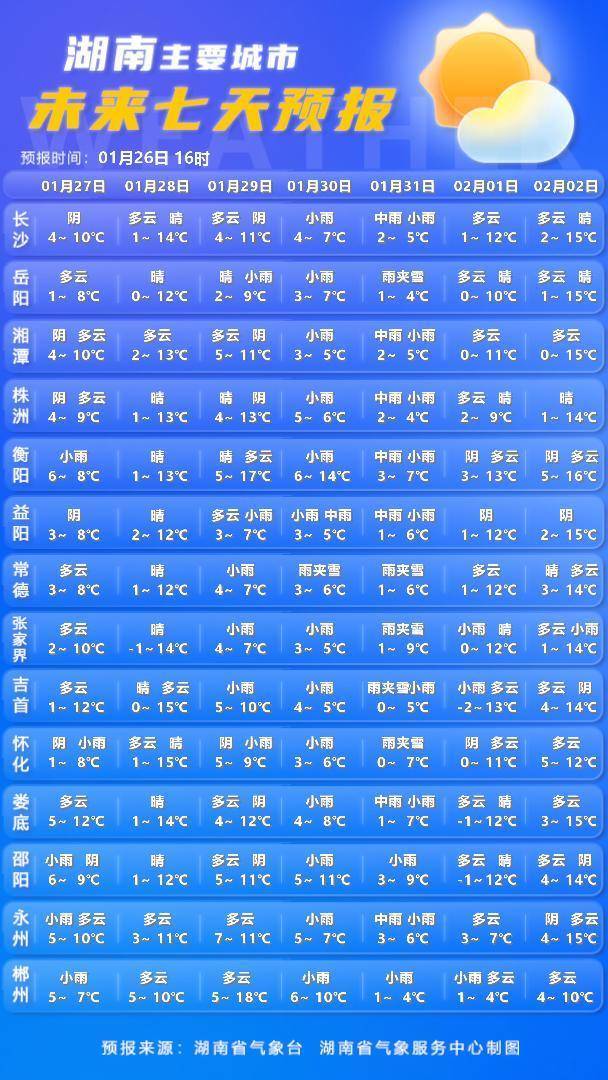 具体预告今天,全省阴天,大部分地区有小雨;最低气温2~6℃;最高气温8~12℃。27日,全省小雨转多云体育游戏app平台,其中白昼湘西北高海拔地区有雨夹雪或小雪;最低气温湘中以北0~3℃体育游戏app平台,其他地区4~6℃;最高气温7~11℃。28日,全省多云间好天,夜间湘西北有小雨;最低气温3~6℃;最高气温10~14℃。29日,湘西、湘北有小到中雨,夜间湘西北高海拔地区有雨夹雪或雪,其他地区多云转小雨;北风加大至3~4级,阵风6~8级。30日白昼,湘西北高海拔地区有雨夹雪或雪,其他地区有小到中雨。30昼夜间至31日白昼,湘中以北部分地区有雨夹雪或雪,其他地区有小雨。31昼夜间至2月1日,全省阴天间多云;湘中以北最低气温仍在0℃独揽。湖南主要城市夙昔7天预告
