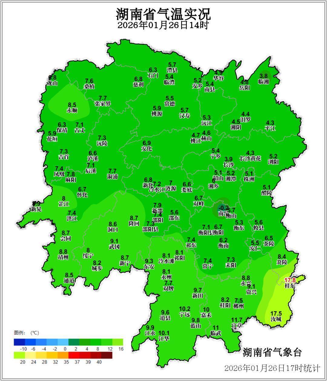 今天(1月26日)湖南大部分地区阴霾为主天气湿冷下昼14时省会长沙气温为3.9℃