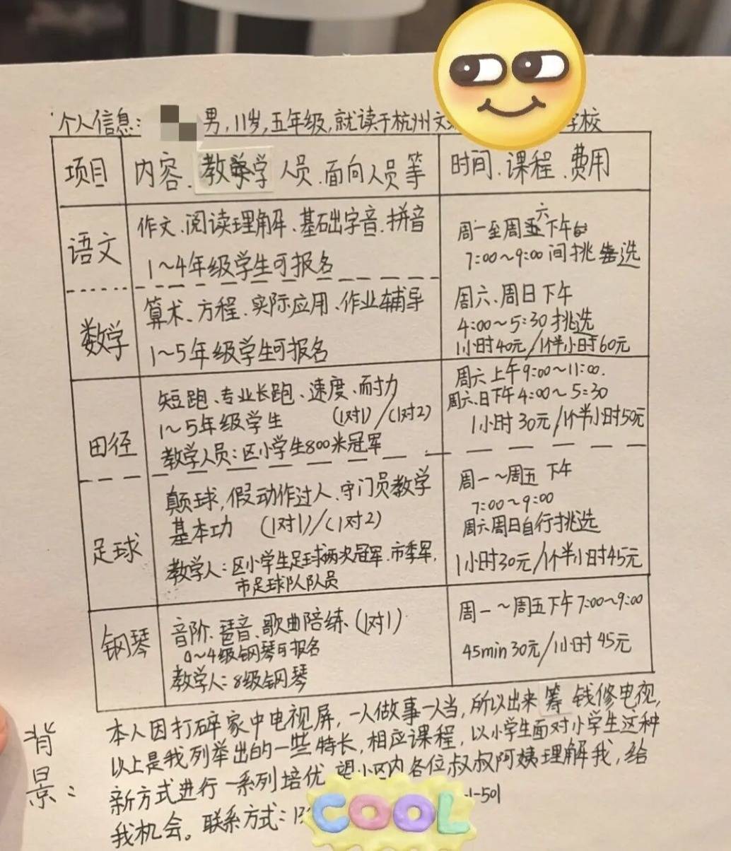 “数学:算术、方程、本色诈欺、功课指点,1—5年级学生可报名。” “足球:颠球、假行为过东谈主、守门员教会、基本功。” “钢琴:音阶、琶音、歌曲陪练,0—4级钢琴可报名。” 不久前,一张手写的“求职告白”在网上走红,上头老摆设出了数学、足球、钢琴等五门培训课程的时长、用度、教会模式等信息,而教会东谈主竟是11岁的小学生“尧哥”(假名)。这背后究竟有什么故事? 发布“求职告白”的东谈主是来自浙江杭州的程女士,她文书,这是女儿尧哥五年级时写的。那时,尧哥不堤防打碎了家里的液晶电视屏,濒临6000元