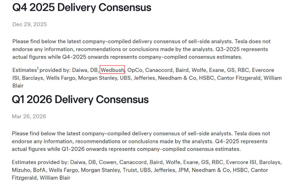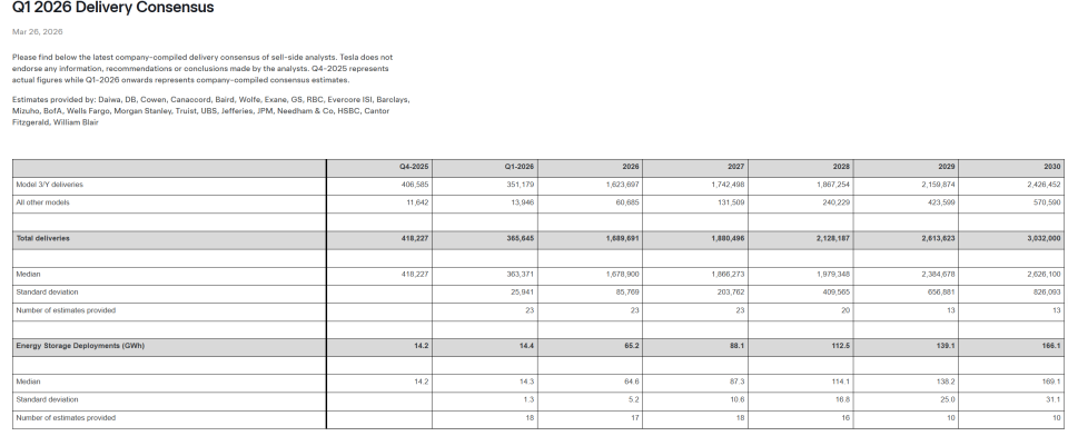 财联社3月27日讯(裁剪 史正丞)一季度汽车录用数据行将出炉之际,“前寰球电动车一哥”特斯拉周四再度发布“卖方分析师预期汇编”开云体育,偷偷调低商场对本年电动车销量回升的期待。 开头:特斯拉 这亦然特斯拉有史以来发布的第二份“分析师预期汇编”。旧年12月底,特斯拉在公布四季度和全年录用数据前,首度编制了一份低于商场举座预期(44.09万)的精选数据(42.28万),而最终的数据以致还低于特斯拉汇编的预期(41.82万)。 特斯拉发布的汇编数据深刻,商场预期公司2026年一季度录用36.56万辆