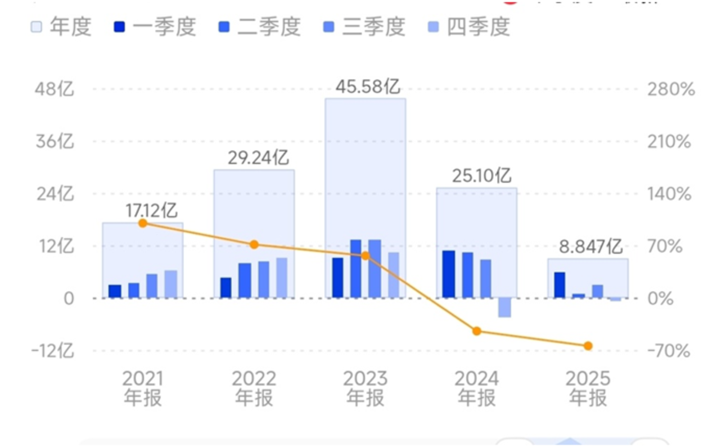 和我方比:晶盛机电的功绩已勾通两年大幅下降,2025年的净利润不足2023年岑岭期的20%。